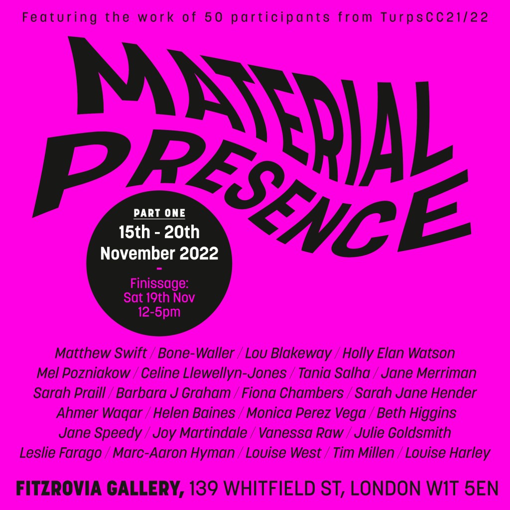 The Finissage of Material Presence Part 2 is today, 26th November, 12-5pm at Fitzrovia Gallery and the last day of the exhibition is tomorrow (10am-3pm)