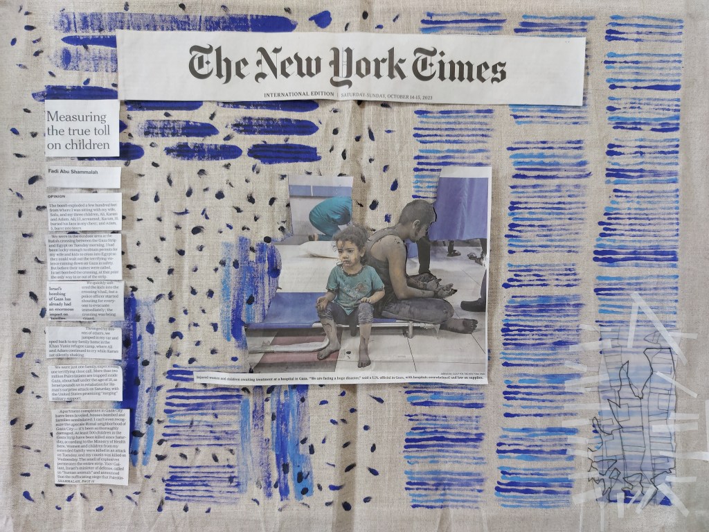 Image shows work in progress. The photo is by Samar Abu Elouf and the article is by Fadi Abu Shammalah. Both are taken from the New York Times (International Edition) published on October 14th-15th 2023.